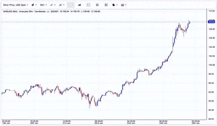 大家发现没有,2026年的金融市场,最扎心的不是黄金又创了新高,而是你曾经瞧不上的白银,居然捅破了100美元的天花板。 逻辑很简单,它跟黄金走势高度重合,但价格却只有对方的几十分之一,波动大、盘子小,适合投机资金在那儿反复横跳。